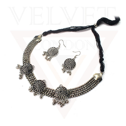 Silver Antique Traditional Oxidized Round Boho Choker Necklace Earring Ethnic