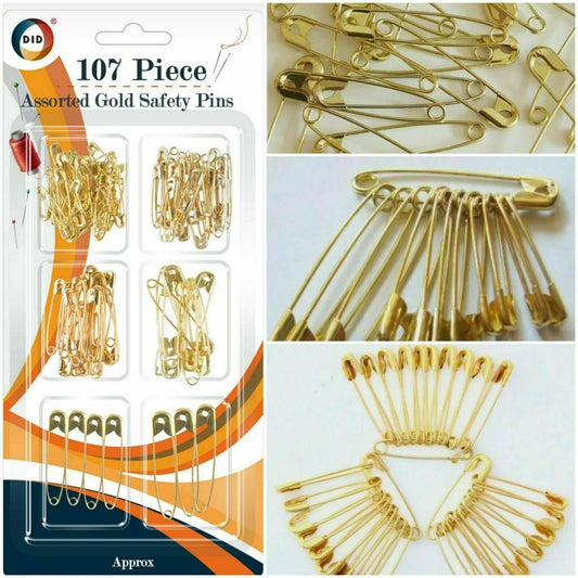Golden Safety Pins 6 Size Assorted Small Medium Large Metal Craft Sewing 107 Pc